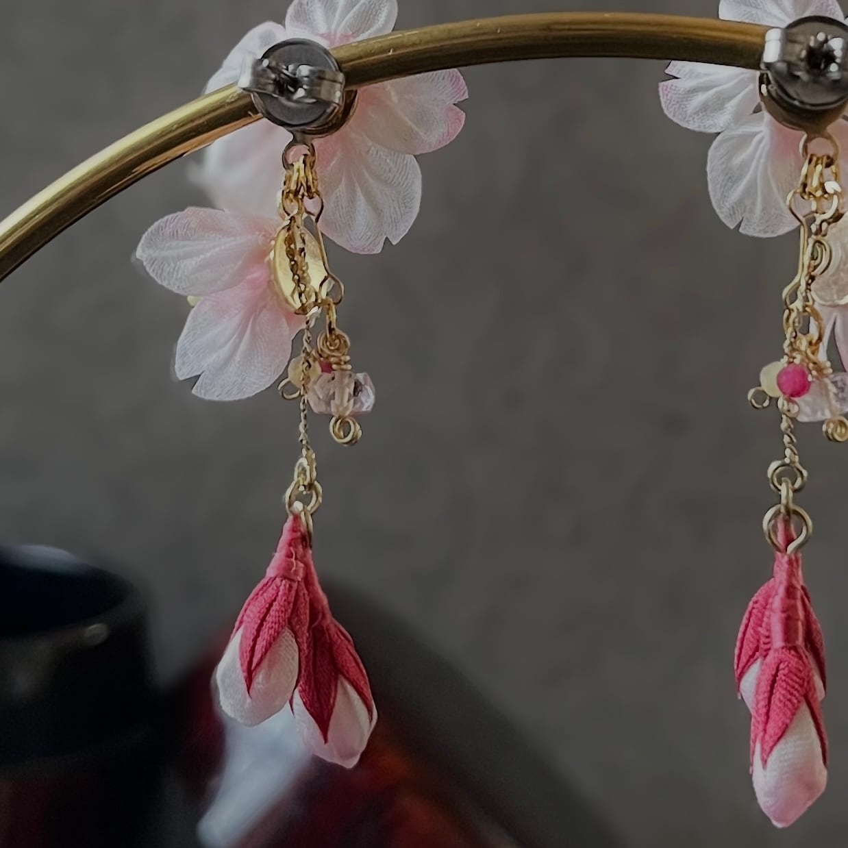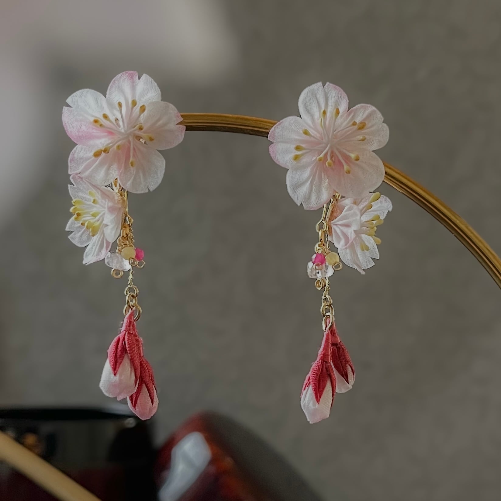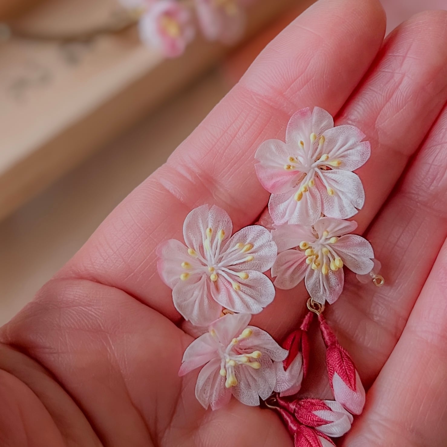 • 一点もの:淡い桜色の花びらにお化粧するようにランダムに紅色をほどこした色彩のゆらぎは、あなたを丸ごと肯定するお守りの証です。