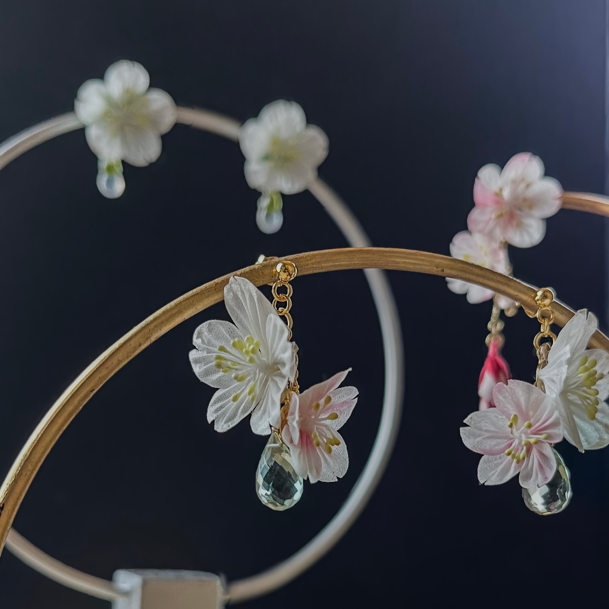 • デザイン:はじまりの桜とぬくもりの桜を隣同士にしたデザイン。雫のように揺れる天然石が、可憐な桜に洗練された輝きを添えます。