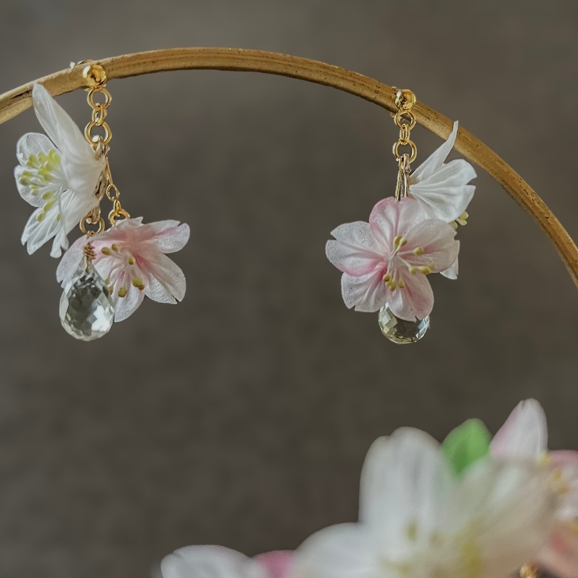 • 天然石:淡く透き通るプラジオライト。石言葉は「誠実な愛」。これから咲き誇るソメイヨシノへの祝福と、時を経ても色褪せない出会いへの感謝を込めて。