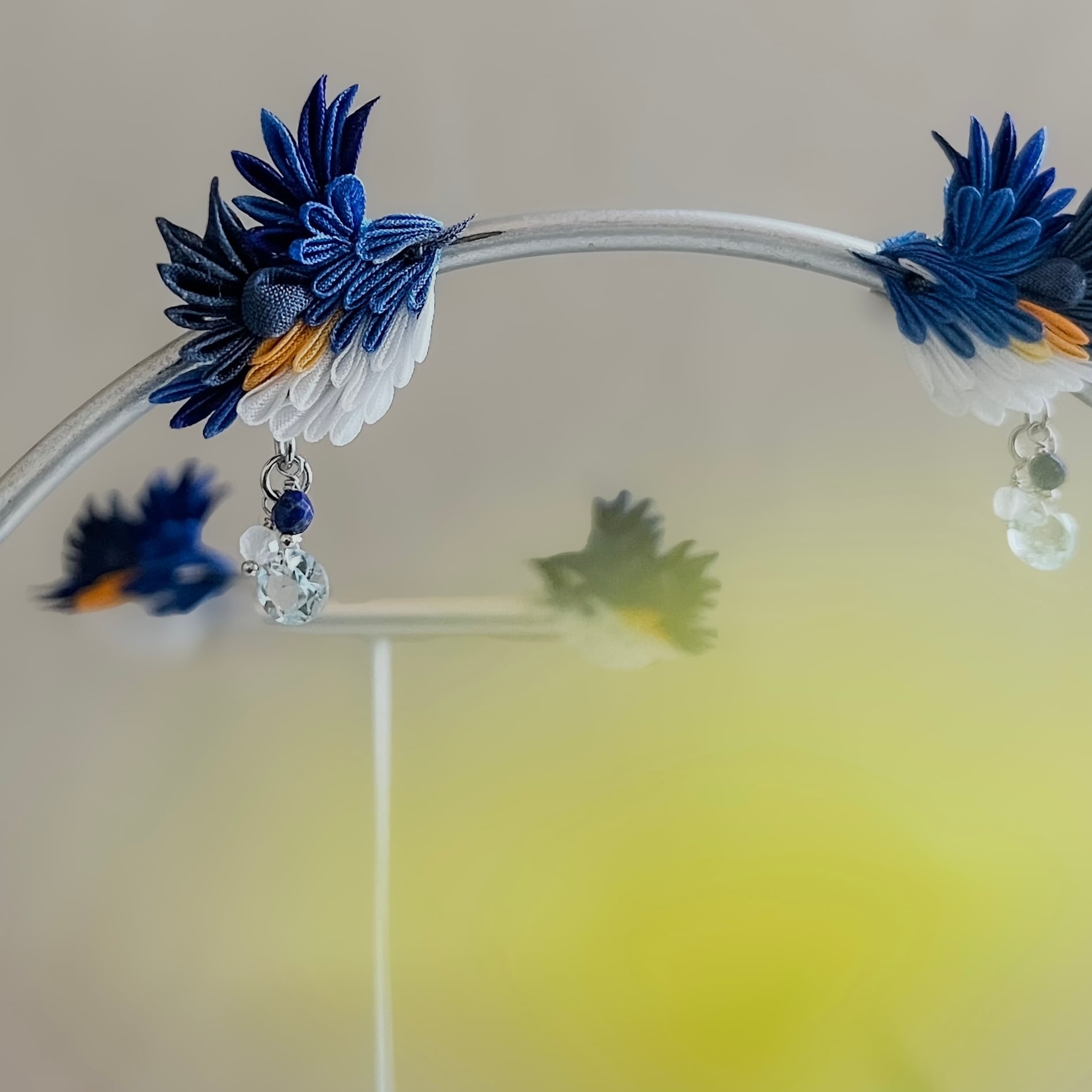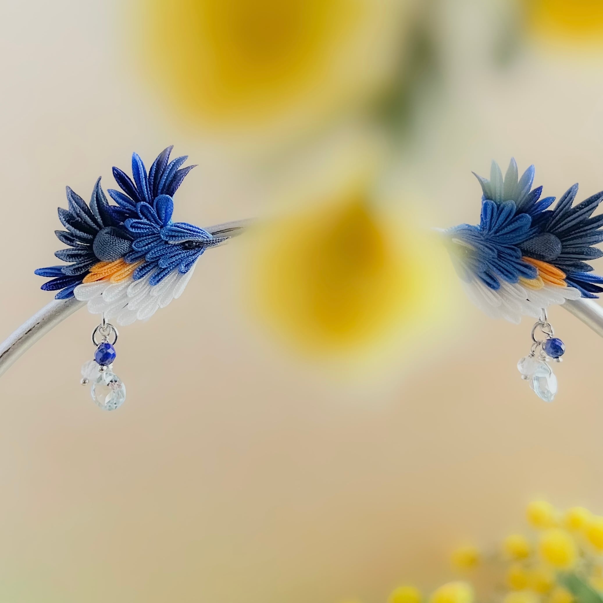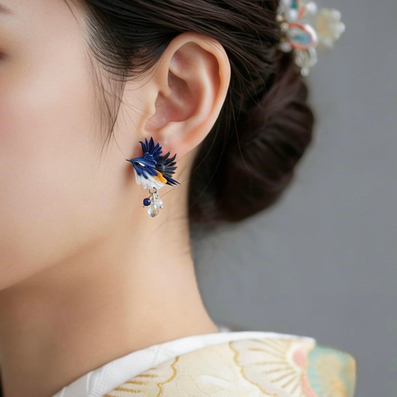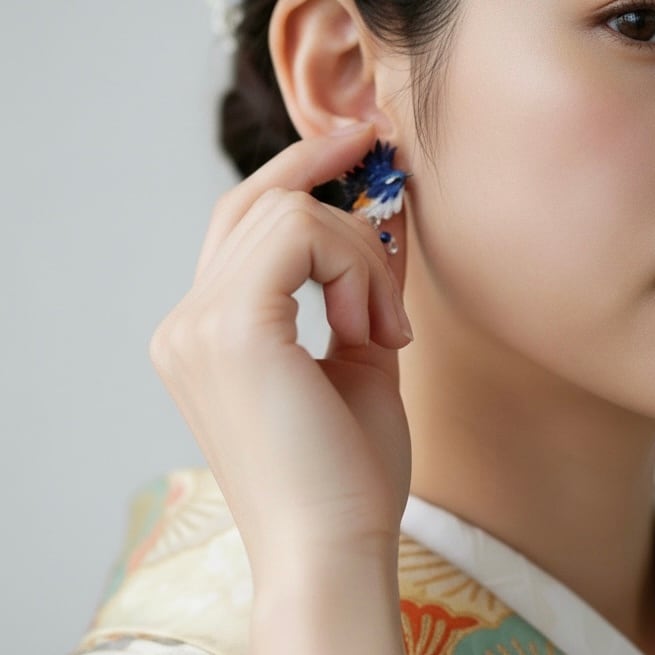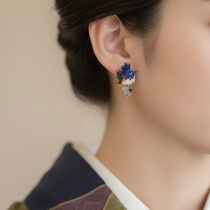 宝石ラピスラズリに由来する深く鮮やかな青に、金青色(こんじょういろ)や紺鼠色(こんねずいろ)を重ね、生き生きとした羽の動きを表現しています。