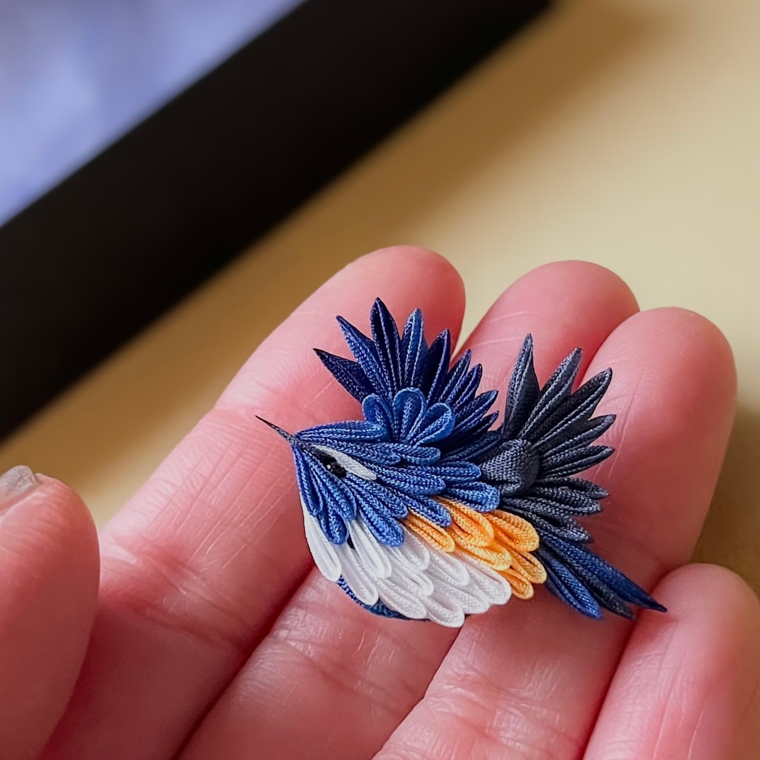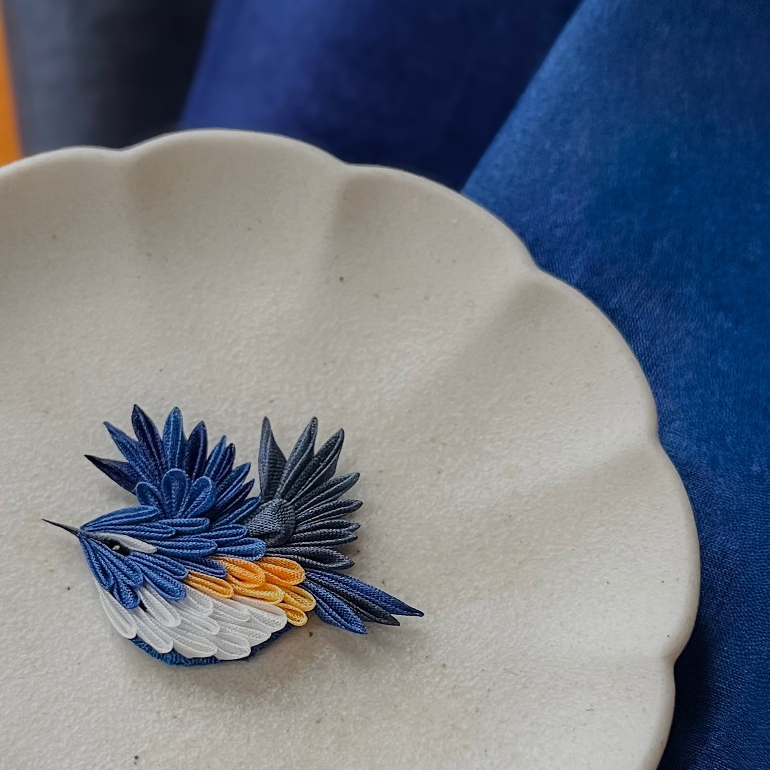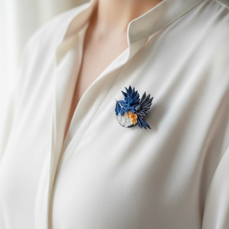 「森の宝石」とも呼ばれる瑠璃ビタキをモチーフにした、存在感のあるブローチ(帯留)です。