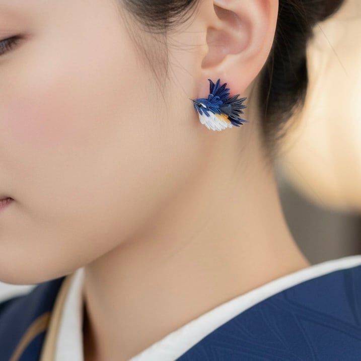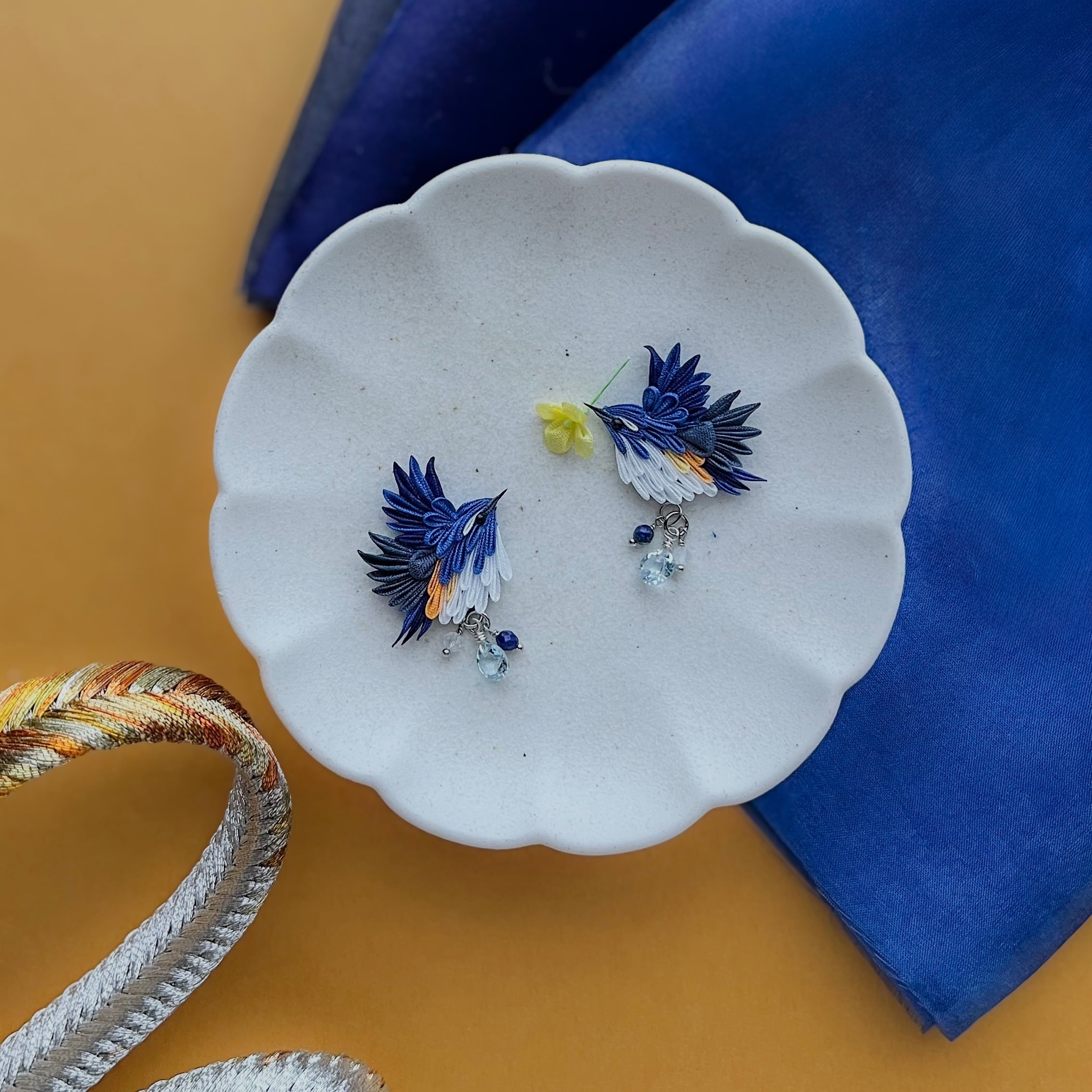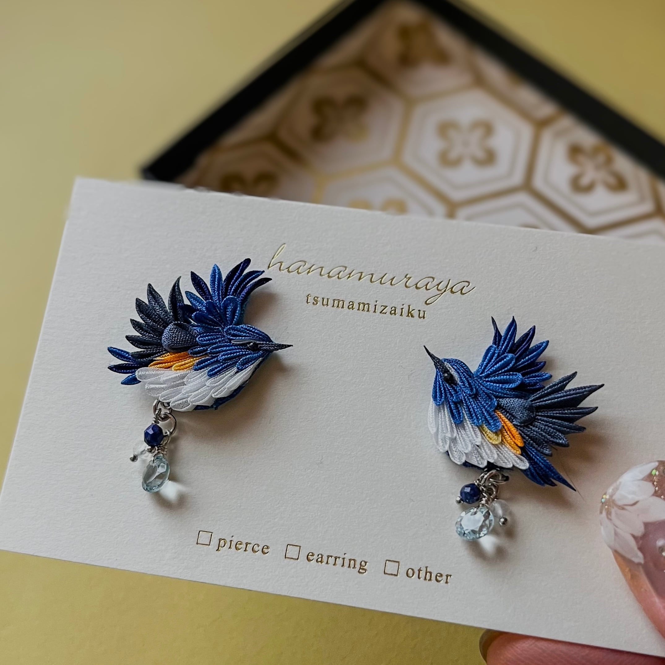 宝石ラピスラズリに由来する深く鮮やかな青に、金青色(こんじょういろ)や紺鼠色(こんねずいろ)を重ね、生き生きとした羽の動きを表現しています。